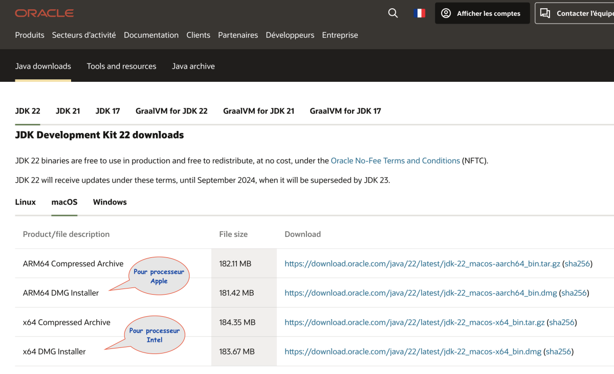 Rendez-vous sur le site d'Oracle et choisissez la version qui correspond à votre machine (pour un Mac équipé d'un processeur Intel, choisissez x64, pour un processeur Apple, choisissez ARM64)