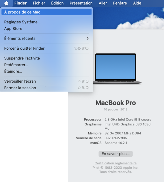 Déterminer le type de processeur de sa machine sous MacOsÉcran : Déterminer le type de processeur d'un Mac⚓ Cliquez sur la Pomme Cliquez sur « À propos de ce Mac » Le type de processeur (Intel ou Apple) Cliquez sur la Pomme⚓ Cliquez sur « À propos de ce Mac »⚓ Le type de processeur (Intel ou Apple)⚓